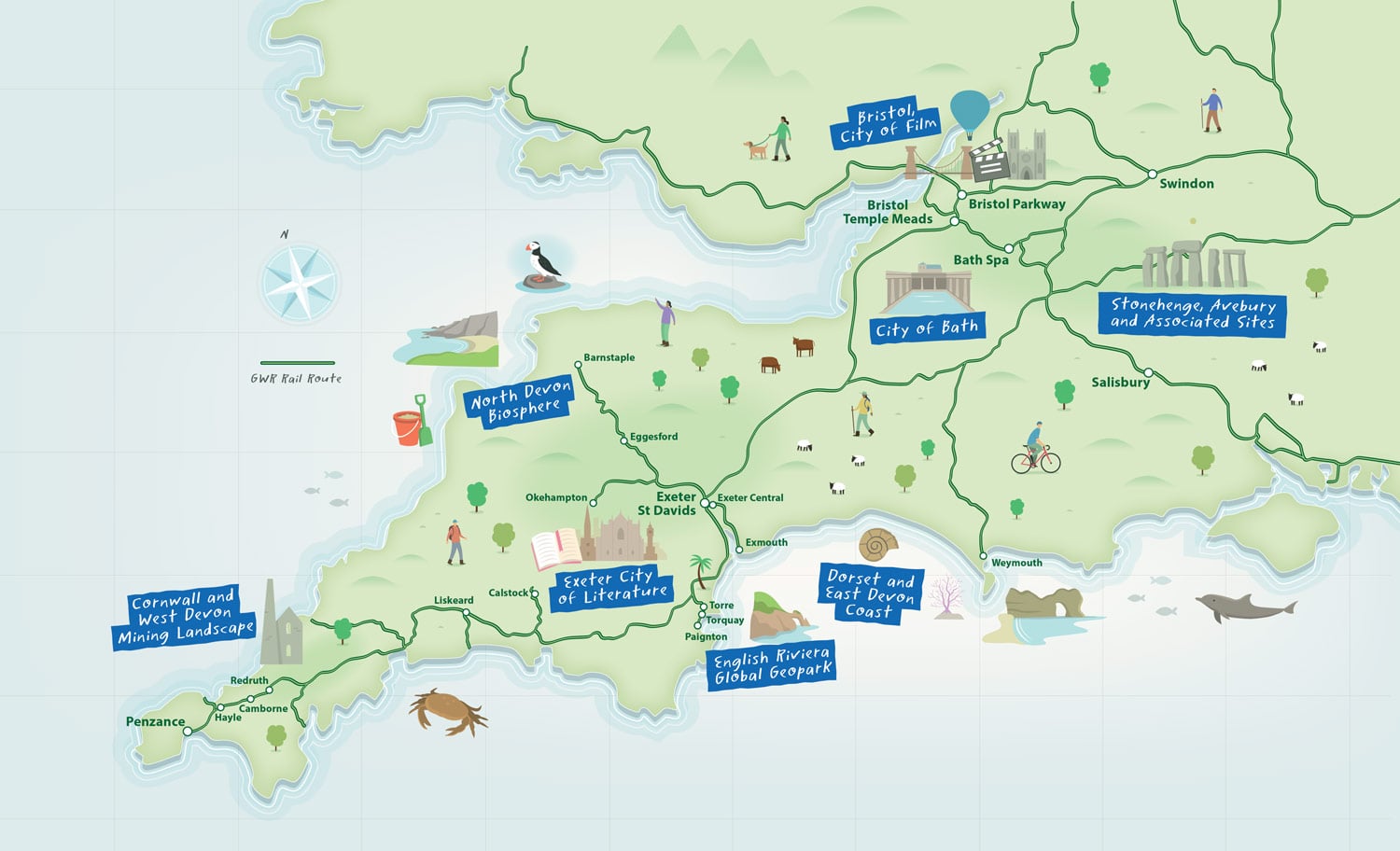 Across the South West, eight UNESCO sites are working in partnership with Great Western Railway to deliver a multi-platform campaign promoting sustainable, rail-based tourism. The project includes a dedicated web presence hosted on the GWR platform, featuring curated itineraries that encourage visitors to explore UNESCO sites by train .